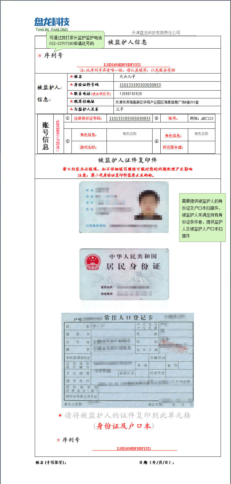 2、被监护人信息表(包含被监护人所玩游戏相关信息及身份证明复印件);