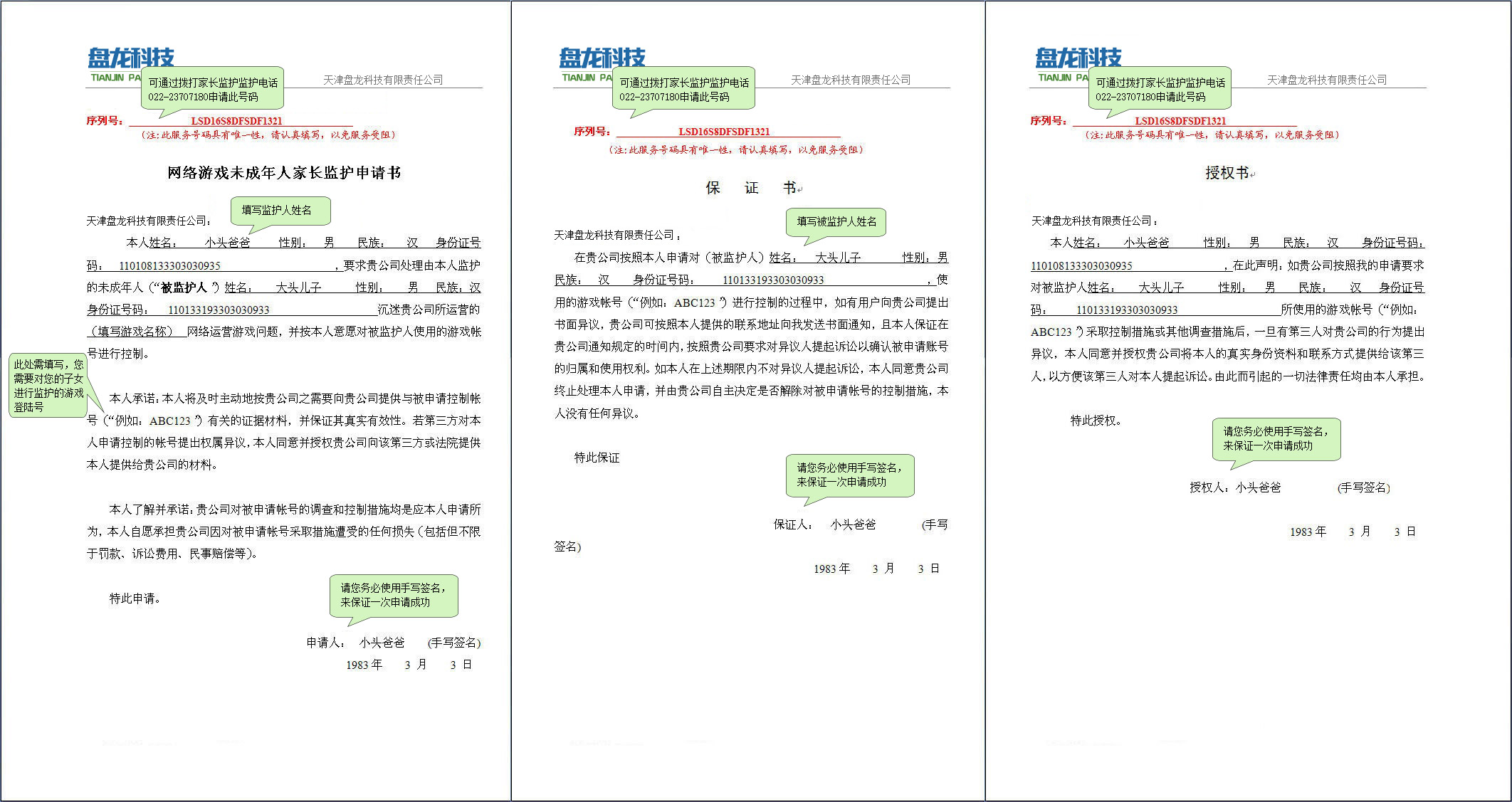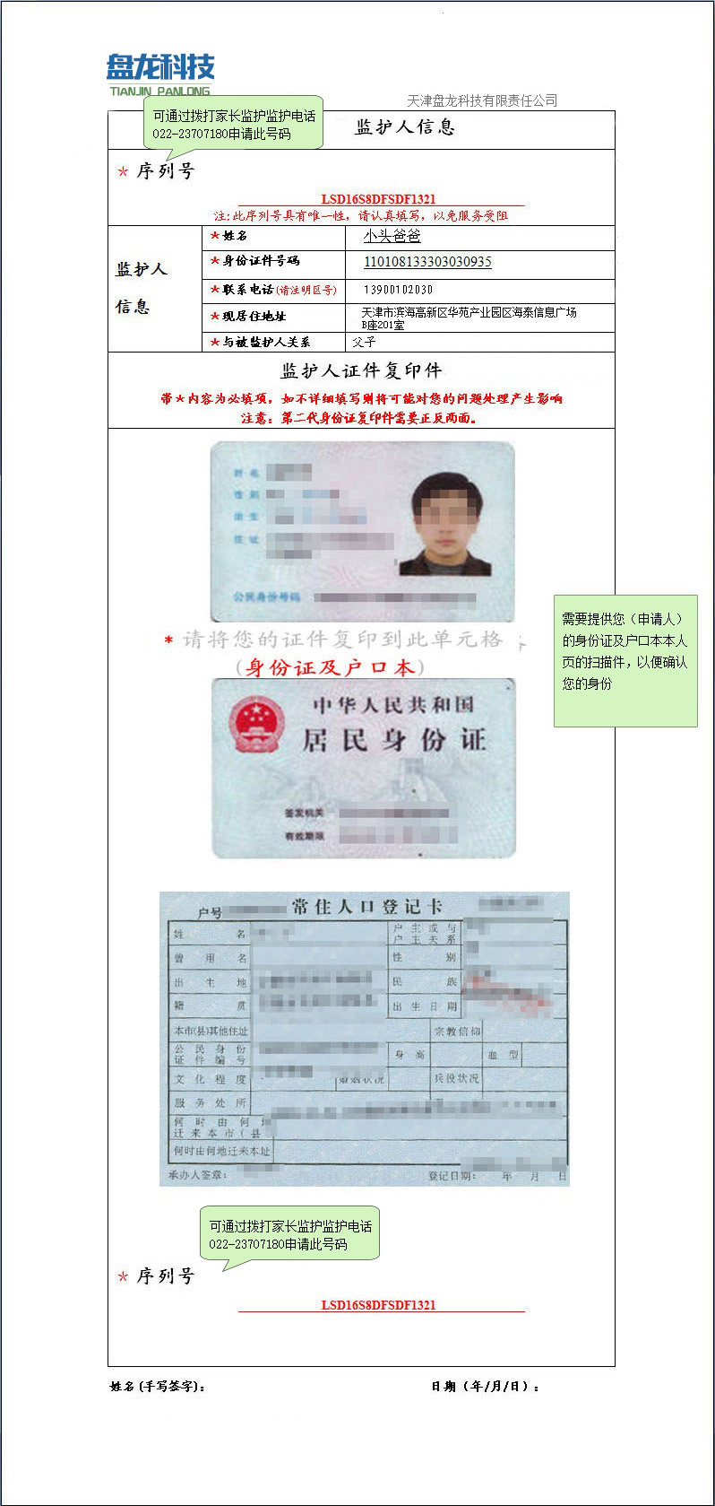 2、监护人可在盘龙科技家长监护系统中下载相应的申请表单,下载完毕后,根据表单中的要求进行填写并手写签名,签名完毕后,连同户口本扫描件,发送至盘龙科技客服中心,发送方式如下: