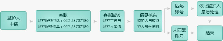 4、身份确认完毕后,监护人主管会在72小时内通知监护人与被监护人监护申请的结果,并安排三方通话最终确认身份,若监护人申请成功,监护主管会按照监护人的申请,对被监护人账号进行处理。