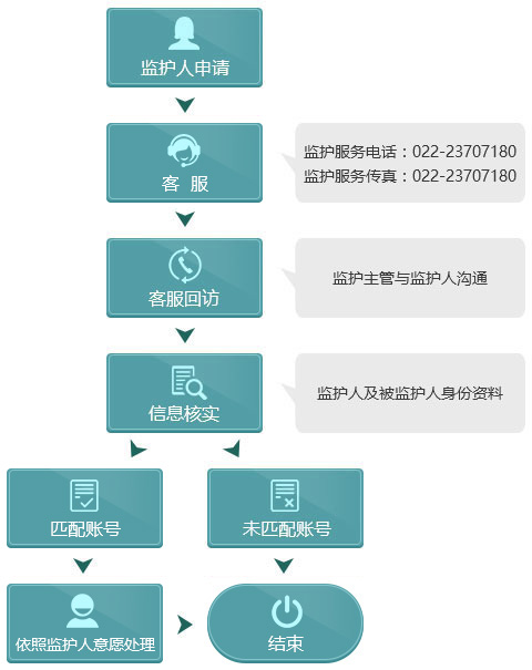 A:我们在收到您的信息,审核后,会在收到信息的48小时之内与您取得联系,对该服务进行说明,并明确告知是否需要您的后续配合。待最终确定账号无误后,我们将对账号进行监控,同时我们会安排监护人、被监护人与监护主管三方进行三方通话,在最终确认的情况下,我们会根据监护人的意见会账号进行处理。